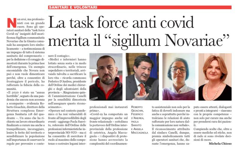 L'amministrazione comunale del Comune di Novara ha assegnato il riconoscimento Sigillum Communitatis Novariae a tutti i cittadini che abbiano dedicato il loro impegno nel mantenere vive le relazioni di aiuto verso coloro che si siano trovati in difficoltà in seguito allo stato di emergenza sanitaria. L'Ostetrica Angela Maccagnola, Presidentessa dell'Ordine delle Ostetriche, ha espresso, a nome di tutte le iscritte, la gratitudine per aver visto riconosciuto l'impegno dei sanitari. Non è scontato vedere ricordato il lavoro delle ostetriche in questa situazione d'emergenza. Anche il percorso nascita, nonostante il momento di gioia, può essere drammaticamente condizionato dall'emergenza.