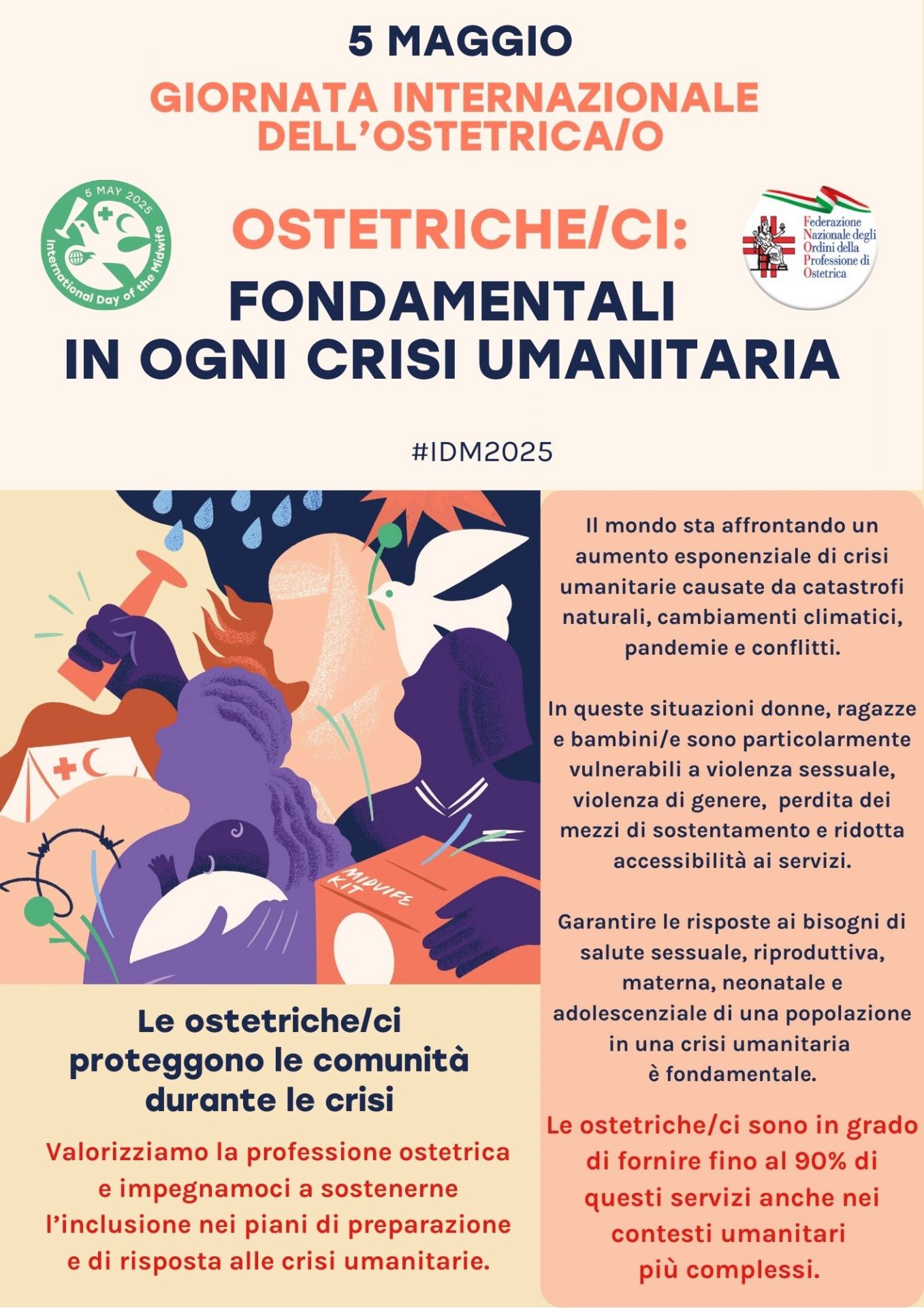 La Giornata Internazionale dell'Ostetrica/o 2025 si focalizza sul ruolo cruciale delle ostetriche/ci in contesti di crisi umanitaria. In situazioni di emergenza come conflitti, disastri naturali o epidemie, il ruolo delle ostetriche è fondamentale nel garantire la salute sessuale, riproduttiva e infantile.